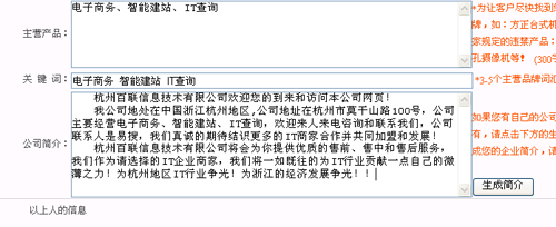 名片企业简介操作起来很简单,只需在添加企业名时在主营产品右边点击生成简介,如下图: