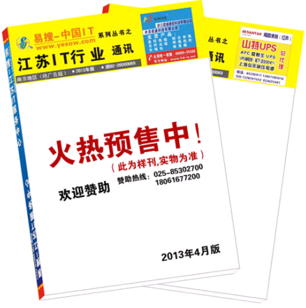 此次易搜《江苏IT行业通讯》颠覆了以往的策划风格,拒绝加入商家广告,真正以准确全面的商家信息为主,以更快、更便捷地定位商家联系渠道为导向,更加诠释了易搜《江苏IT行业通讯》准确、全面、快速查找所要信息的强势优点!!为感谢长期以来江苏及各地IT朋友们对易搜通讯录的关注支持,我中心决定将2013年4月易搜《江苏IT行业通讯》在出版之前进行感恩价预售,详细如下:
